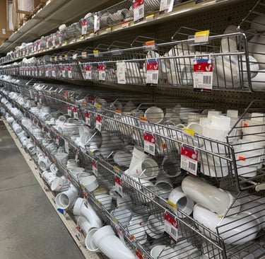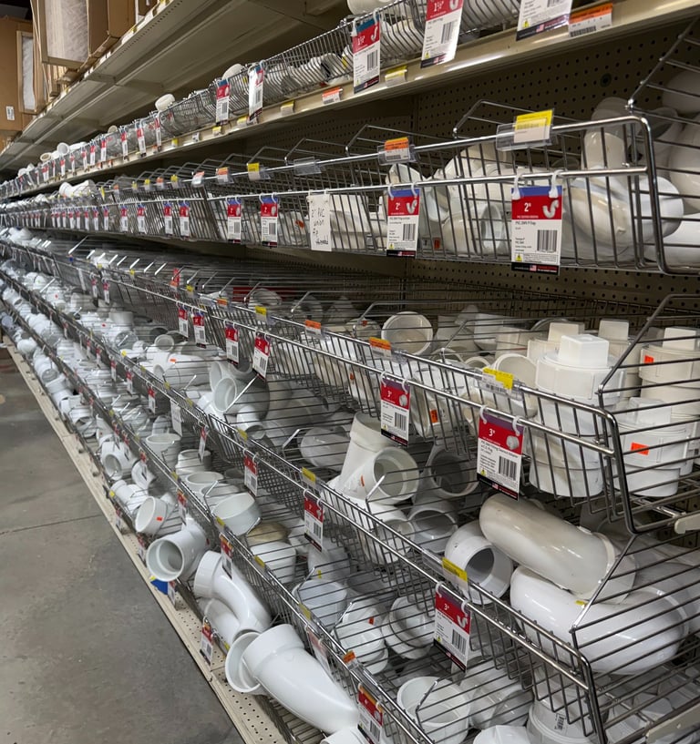 PVC and Copper pipe, SharkBite fittings, faucets, toilet repair kits, and outdoor irrigation/sprinklers.